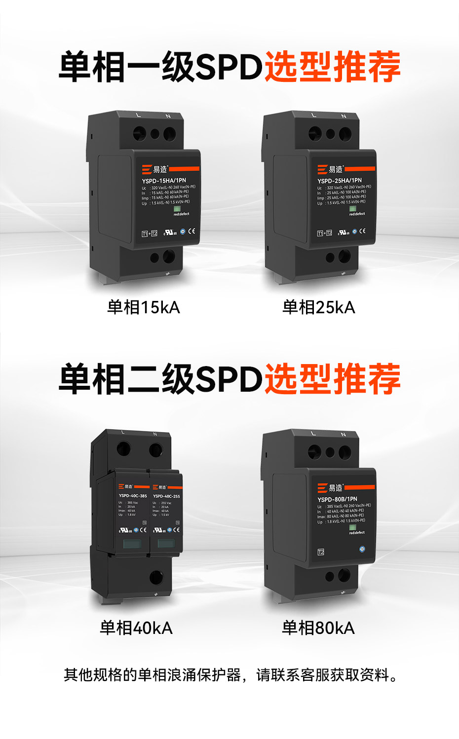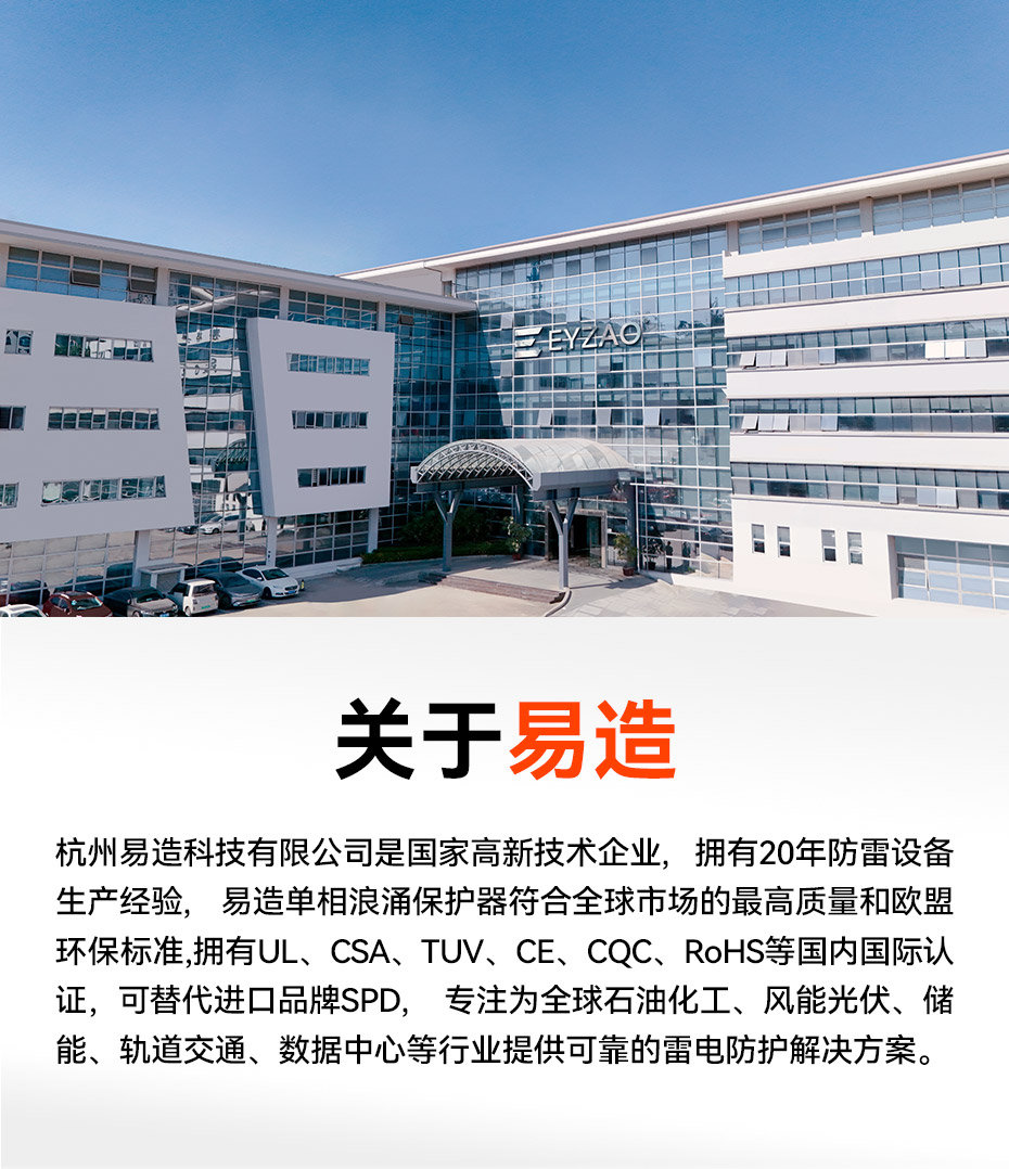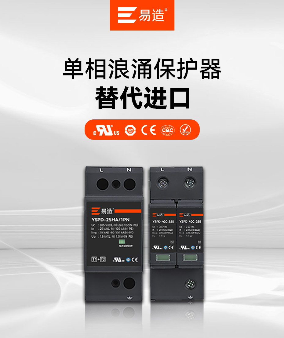 易造T1級、T2級單相浪涌保護器,規格型號齊全,擁有UL、TUV、CE、CQC等國內國際質量認證,符合全球市場的最高安全和RoHS歐盟環保標準,可替代進口品牌SPD,支持出口。