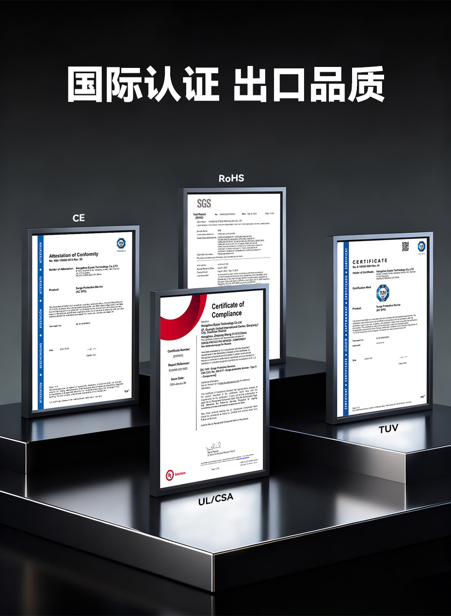 易造T2級大通流浪涌保護器,擁有UL、TUV、CE等國際質(zhì)量認證,符合全球市場的最高安全和RoHS歐盟環(huán)保標準,可替代進口品牌SPD,支持出口。