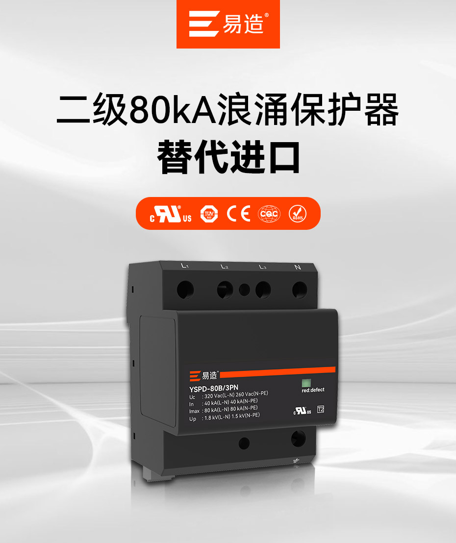 易造T2級(jí)大通流浪涌保護(hù)器,擁有UL、TUV.CE、COC等國(guó)內(nèi)國(guó)際質(zhì)量認(rèn)證,符合全球市場(chǎng)的最高安全和RoHS歐盟環(huán)保標(biāo)準(zhǔn),可替代進(jìn)口品牌SPD,支持出口。
