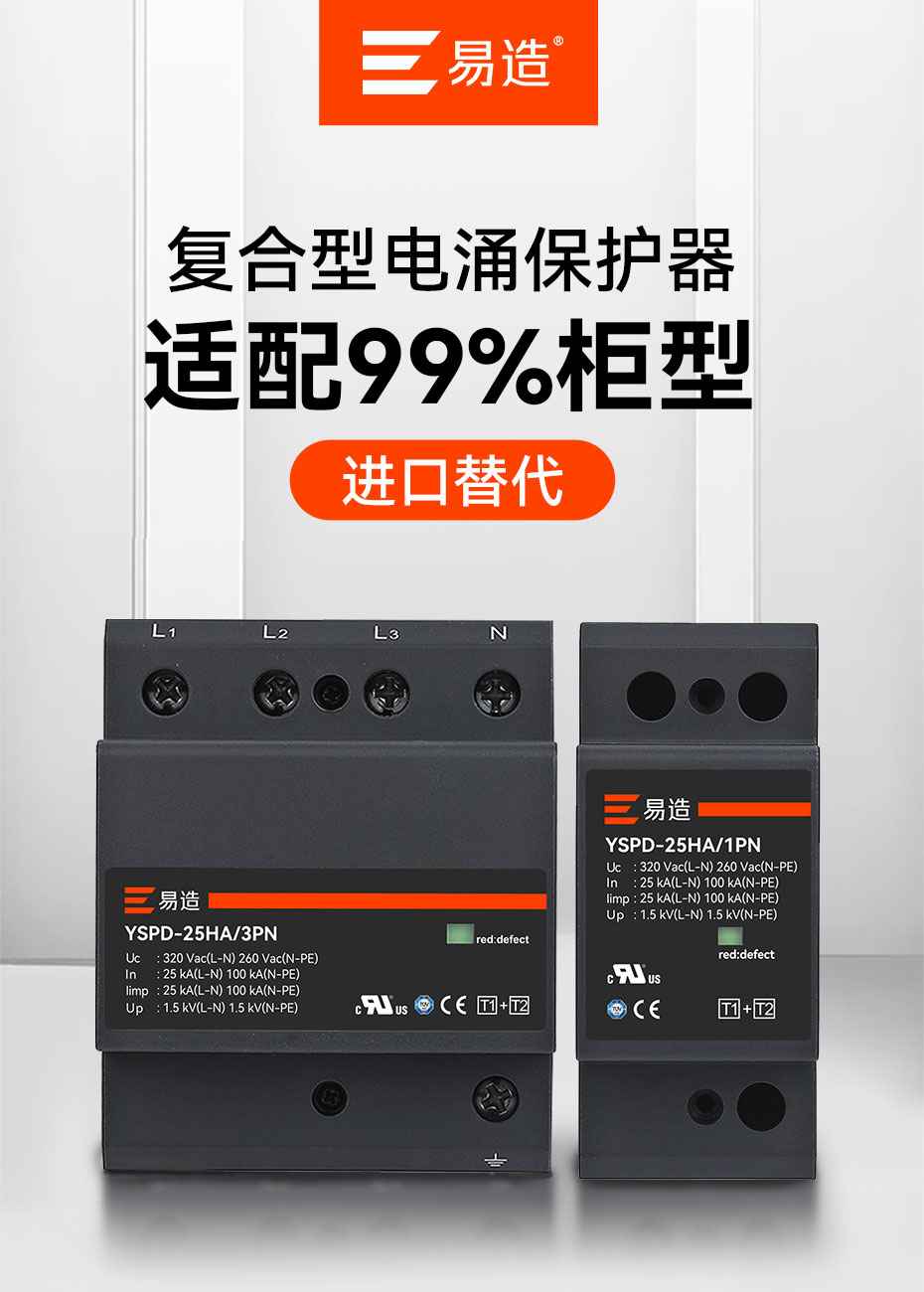 易造YSPD系列一級、二級、三級電涌保護器將安全和創新出色地融合在一起,采用突破性MG復合型技術,解決了傳統SPD的短板缺陷,無續流無漏電流,延長了SPD使用壽命并提高了供電效率;易造SPD小型化設計,每相寬度僅一個模數(18mm),使配電箱的空間更充裕,并具有本地及遠程告警功能,維護方便;靈活的鏈式放電技術簡化了SPD的安裝方式,上下級SPD能量自動配合,無需退耦器,顯著提升了電涌保護效率和TOV耐受能力,確保供電系統的穩定性。